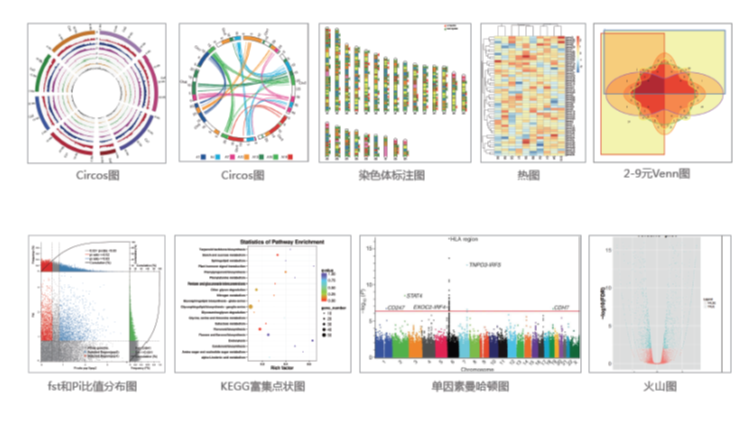百邁客生物云平臺通過對大量已發(fā)表論文中的圖和表進行總結(jié),編制了大量的圖表繪制軟件,用戶可以根據(jù)自己的需求進行變換,找到適合的方式。常用的圖表類型包括:點線圖、餅狀圖、柱狀圖、Venn 圖和熱圖等。