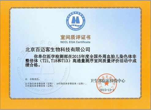2015年12月 14日,百邁客醫(yī)學(xué)收到衛(wèi)生部臨床檢驗(yàn)中心發(fā)來(lái)的室間質(zhì)評(píng)證書,證書顯示百邁客醫(yī)學(xué)參加的“外周血胎兒染色體非整倍體(T21、T18、T13)高通量測(cè) 序室間質(zhì)量評(píng)價(jià)活動(dòng)中成績(jī)合格”,順利通過(guò)2015年度室間質(zhì)評(píng)。表明百邁客在2015年11月的該項(xiàng)目室間質(zhì)評(píng)再次獲得滿分,此前,在2015年5月的 室間質(zhì)評(píng)中,該項(xiàng)目亦滿分通過(guò)。