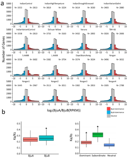 由于芥菜基因組是異源四倍體,也就是說基因組中存在兩套非常相似的亞基因組,那么在基因表達的過程中,位于兩套亞基因組上的等位基因的表達模式是怎么樣的呢,是一起表達,是相互抑制,還是一方占主導?