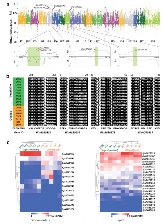 通過菜用和油用芥菜群體進行選擇清除分析,發(fā)現(xiàn)dominance的基因被篩選出來的比例較高,同時結(jié)合轉(zhuǎn)錄組數(shù)據(jù),這部分基因在油用和菜用兩個群體中差 異表達。同時通過上面的分析發(fā)現(xiàn)與硫苷,脂類代謝顯著相關(guān)并且存在dominance的基因組,這些基因在油用菜用群體中有各自獨特基因分型。