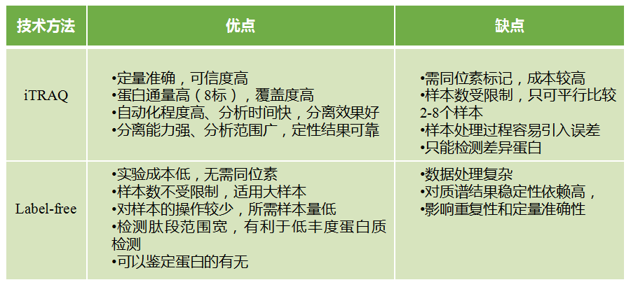 以質(zhì)譜為基礎(chǔ)的定量蛋白質(zhì)組學(xué),主要可以分成兩類,第一種是穩(wěn)定同位素標(biāo)記的定量蛋白質(zhì)組學(xué),比如iTRAQ;第二種是非標(biāo)記的定量蛋白質(zhì)組學(xué)技術(shù),比如label-free。iTRAQ定性定量結(jié)果更為準(zhǔn)確,通量較高可同時(shí)標(biāo)記2-8個(gè)樣本,但是對(duì)樣本數(shù)有一定限制且不適用于低豐度蛋白的定量,適合小樣本量的項(xiàng)目;label-free檢測(cè)肽段范圍廣,單次可鑒定和定量較多的蛋白質(zhì),但由于樣品單獨(dú)進(jìn)行質(zhì)譜檢測(cè)所以重現(xiàn)性較低,在大量算法的基礎(chǔ)上更適合大量樣本的蛋白組研究。