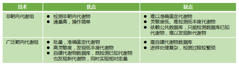 非靶向代謝組和廣靶代謝組是目前代謝組學(xué)常用的技術(shù)。非靶向代謝組是將對(duì)照組和實(shí)驗(yàn)組樣本的全部代謝物進(jìn)行比對(duì),以找出其代謝物的差異。廣靶代謝組是高通量、高靈敏度靶向代謝物檢測(cè)技術(shù),提供了定性、定量檢測(cè)大批量、低豐度代謝物高效的方法, 有助于全面解析差異代謝物與代謝途徑。