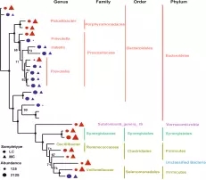 在門水平,MC組的擬桿菌門和厚壁菌門顯著性高于Lc組(P<0.05),互養(yǎng)菌門顯著性低于Lc組(如下圖4),通過最大似然法(ML)計算27個豐度大于1% 的OTU進(jìn)行分析顯示,在MC組顯著增加的OTU屬于子單胞菌科,疣微菌科、韋榮球菌科、疣微菌門,相反的,58%(7/12)顯著降低的OTU屬于普雷沃氏菌科(如下圖5);