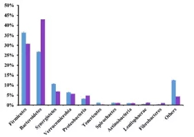 在細(xì)菌門水平,一共有14個原核的門被鑒定,主要是厚壁菌門(35.7-30.1%),擬桿菌門(26.6-43.6%)、互養(yǎng)菌門(11-7%),且通過門水平維恩圖分析發(fā)現(xiàn),在兩組(MC和LC)間門水平組成相同,比較分析兩組間微生物變化情況發(fā)現(xiàn)(如圖:FIG2),MC組相比于LC組,互養(yǎng)菌門增長了57%,無壁菌門增長了330%。而黏膠球形菌門降低了63%,纖維桿菌門降低了65%;