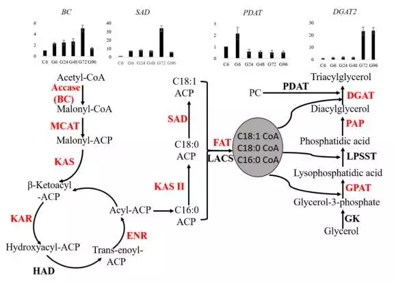 藻類和植物中脂肪酸的生物合成主要在葉綠體中進(jìn)行。乙酰-CoA作為合成的起始物質(zhì)?;谵D(zhuǎn)錄組測序,小球藻質(zhì)體中脂肪酸合成基因被鑒定到。在葡萄糖處理情況下,這些基因大都表達(dá)量上調(diào)。另外這次測序結(jié)果中還發(fā)現(xiàn)幾個基因?qū)?yīng)的不同轉(zhuǎn)錄本。由于BC和SAD是脂肪酸合成的限速酶基因,做了進(jìn)一步分析,發(fā)現(xiàn)BC和SAD表達(dá)量從6h到72h表達(dá)量持續(xù)上升,對應(yīng)的三酰甘油含量從24h到96h持續(xù)增加。