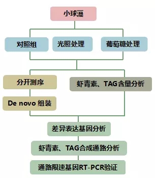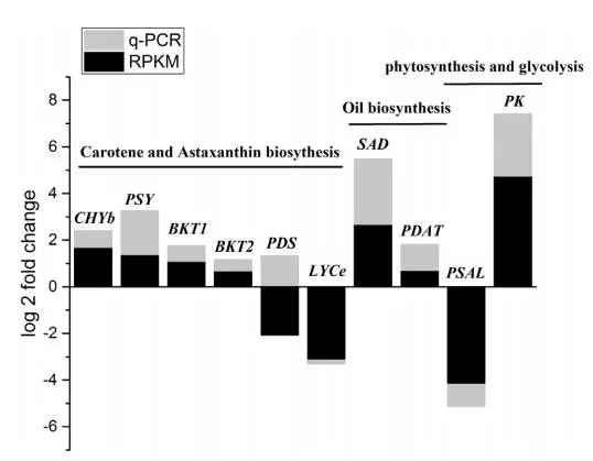 作者選了10個與蝦青素和三酰甘油合成有關(guān)的unigenes進(jìn)行了RT-PCR驗證,其中9個基因的表達(dá)趨勢與RNA-seq結(jié)果一致。只有PDS兩種結(jié)果不同,可能是RNA-seq結(jié)果不準(zhǔn)確,因為前人的研究成果中,葡萄糖是上調(diào)PDS表達(dá)的,與本文中RT-PCR結(jié)果一致。