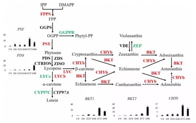 在轉(zhuǎn)錄組測序結(jié)果中,發(fā)現(xiàn)MEP通路中的8個基因都被鑒定到,但是在MVA通路中只有2個基因被檢測到,其中HMG表達(dá)不顯著,ACAT表達(dá)量下降。這些結(jié)果表明小球藻中蝦青素的合成通路中IPP和DMAPP是MEP通路合成的。其中,發(fā)現(xiàn)一個可能編碼β-胡蘿卜素激酶(BKT2)與數(shù)據(jù)庫中的BKT1比對率僅為56%。功能分析發(fā)現(xiàn)BKT2可以轉(zhuǎn)化β-胡蘿卜素成為角黃素。下圖為蝦青素合成通路圖。在葡萄糖處理情況下,與蝦青素合成相關(guān)的6個基因上調(diào)差異表達(dá)。在小球藻中,葡萄糖誘導(dǎo)蝦青素的合成,伴隨著BKT1,CHYb,PDS在24h內(nèi)上調(diào)表達(dá)。為研究轉(zhuǎn)錄組水平基因表達(dá)量與產(chǎn)物含量的關(guān)系,分析了5個限速基因的表達(dá)量,這些基因在葡萄糖處理72h或92h表達(dá)量達(dá)到最高,相應(yīng)的,蝦青素的積累量也在96h達(dá)到穩(wěn)定水平。