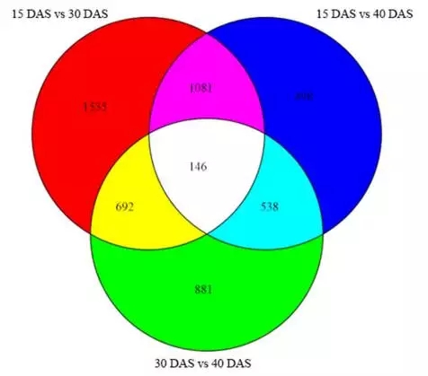 3.為了鑒定在洋蔥球莖膨脹過程中活躍的通路,將得到的unigenes與KEGG數(shù)據(jù)庫中標準參考通路進行比對。15 DAS vs. 30 DAS注釋到了95個pathway,15 DAS vs. 40 DAS 注釋到了79個pathway,30 DAS vs. 40 DAS注釋到了86個pathway。共有6113個unigenes注釋到了120條KEGG通路中?!暗矸酆驼崽谴x”構成了各樣本文庫中的初級代謝途徑,并有可能在球莖膨大和發(fā)育過程中活性更高。