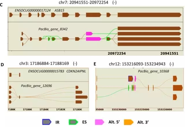 PacBio鑒定到多達(dá)24,797個(gè)AS事件,并對(duì)這些可變剪接進(jìn)行分類統(tǒng)計(jì)(Table 1),在兔的參考基因組中僅發(fā)現(xiàn)2,398個(gè)AS事件,將數(shù)據(jù)合并后共得到34,173個(gè)AS事件,且可變剪接事件包含不同的4中類型,另外,鑒定到11,184個(gè)APA事件。挑選5個(gè)基因,并用圖表示出不同的isoform比對(duì)到參考基因模型上(Figure 2)。