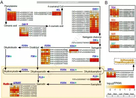 蘆丁的生物合成具有特殊的意義,而苦蕎被認(rèn)為是這種有益的類黃酮的主要食物來源。苦干蕎麥營(yíng)養(yǎng)生物質(zhì)中含有3%的蘆丁。通過比較基因組以及不同生長(zhǎng)部位的轉(zhuǎn)錄組測(cè)序,發(fā)現(xiàn)原來所不知道的全長(zhǎng)蛋白CHI(FtPinG0002790600)和f3h(FtPinG0006662600)。