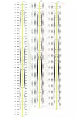 本研究所用的群體類型是F1,149個個體,利用SLAF-seq技術(shù)對樣品進(jìn)行高通量測序開發(fā)分子標(biāo)記。共獲得456,620,260個reads,開發(fā)了114,829個SLAF標(biāo)簽,其中多態(tài)性標(biāo)記25,140個,成功編碼的高質(zhì)量標(biāo)記6359個,采用擬測交的原理構(gòu)建了包含44個連鎖群的遺傳圖譜,總圖距為4,271.43 cM,平均圖距為0.7cM,其中雄性圖包含4201個標(biāo)記,雌性圖包含4396個標(biāo)記,中性圖包含6146個標(biāo)記,同時對構(gòu)建的圖譜進(jìn)行了獨創(chuàng)性的圖譜評價。
