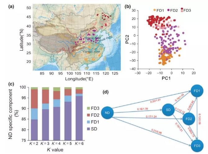 (2)通過基因滲透和PCA分析推出半馴化品種是一種進化上的中間產物,而不是馴化品種和野生大豆雜交產生的,此外,三群體檢測的結果也進一步論證了這一點,同時,論證出栽培大豆是從中部黃淮海地區(qū)向北向南馴化,進而將中國馴化大豆起源√確的定位到中國中部黃淮海區(qū)域。