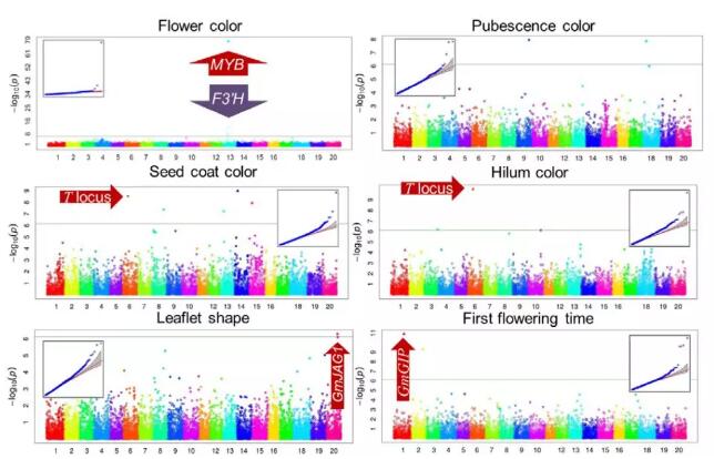(3)基于SNP分型結果,定位到與15個性狀相關的43個區(qū)域,如與茸毛和種皮顏色相關的基因被定位在Gm06染色體,與葉形相關的基因被定位在Gm20染色體。在與10個質量性狀相關的25個QTNs中,有3個QTNs位于之前已經(jīng)報道過的QTLs或基因區(qū)域。