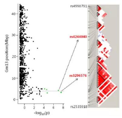 (3)基于獲得的25179個SNP,采用Naive、GLM 和CMLM 三種模型進行關聯(lián)分析,在Gm13上定位到3個熱點標記,通過比較發(fā)現(xiàn)GWAS和遺傳圖QTL定位結果是重疊的。進一步對候選基因進行功能注釋,有4個基因與植物病害應答機制或色素合成有關。