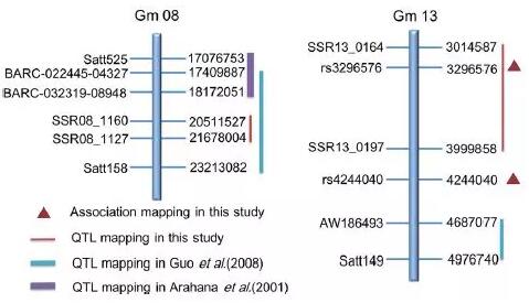 (2)在前人研究基礎上,利用Gm01, Gm08, Gm11和Gm13上的78個SSR構建遺傳圖譜,在Gm13上定位到主效QTL位點Oswm13-1。