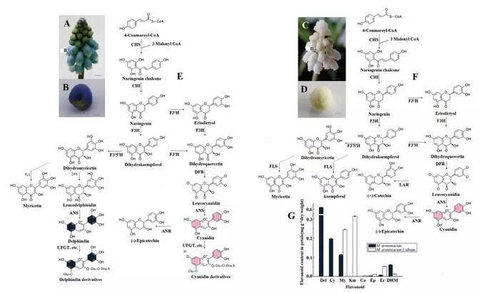 葡萄風信子(Muscari)是一種重要的觀賞性球根植物,具有獨特藍色、花形和甜香。天然突變種白色風信子為探究某些潛在生化特征,特別是顏色相關的復雜代謝網(wǎng)絡研究提供了機會。據(jù)報道,花青素是風信子花色的主要色素。藍色花主要由飛燕草色素(Del)決定,紅色花由花青色素(Cy)決定?;ㄇ嗨厥侵参锟茖W中研究最多和最了解的化合物之一,然而,在不同植物中調(diào)控花青素分解代謝的分子機制還遠遠沒有定論。