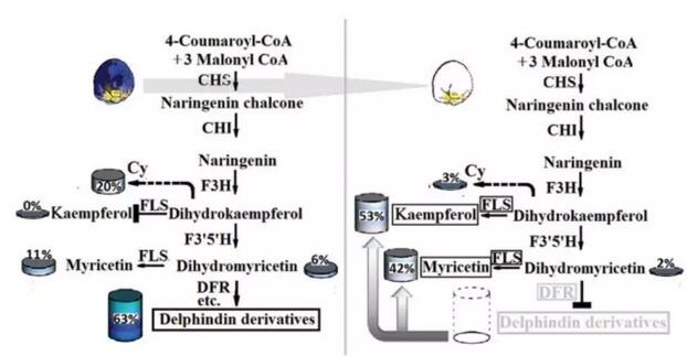 在藍色風信子中檢測到與Del合成相關的部分同源序列的表達上調(diào),在某些情況下,高出> 1000倍。結合HPLC分析結果,DFR可能是白色葡萄風信子中藍色色素沉積(Del)消失的靶基因。另外,F(xiàn)LS和DFR在共同的二氫楊梅素底物之間的強烈競爭,可能部分地阻斷Del的合成并引起其他類黃酮化合物,如楊梅素的產(chǎn)生,由此進一步消除白色風信子中藍色色素沉積。