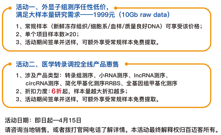 開學(xué)季,放禮季,百邁客醫(yī)學(xué)產(chǎn)品全線促銷活動(dòng)開啟。百邁客全外顯子組測序(10Gb/樣本,Q30>85%),主流外顯子捕獲平臺(tái)羅氏NimbleGen SeqCap EZ Exome Library V3和安捷倫 SureSelect Human All Exon V6,一律1999元/樣本?。ǖ饶銇韮旛r)