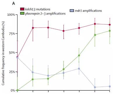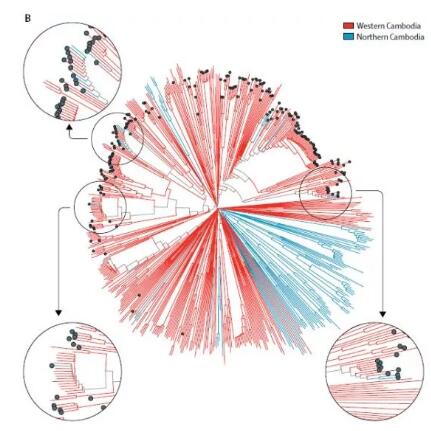 研究人員通過對(duì)來自于東南亞的1492例惡性瘧原蟲樣本的基因組序列數(shù)據(jù)分析,其中包括2007至2013年間在柬埔寨西部收集的464個(gè)惡性瘧原蟲樣本,耐藥性的不同流行病學(xué)起源通過對(duì)Kelch13青蒿素耐藥基因座和plasmepsin 2-3 哌喹耐藥基因座的單倍型分析進(jìn)行鑒別。最終確定了30多個(gè)獨(dú)立的青蒿素耐藥性起源,其中91%為KEL1譜系(140/154)為耐受雙氫青蒿素哌喹抗性的寄生蟲。2008年,KEL1譜系和與哌喹抗性相關(guān)PLA1譜系相結(jié)合。2013年,KEL1/PLA1 結(jié)合譜系在柬埔寨西部頻率達(dá)到63%(24/38),并已蔓延至柬埔寨北部。