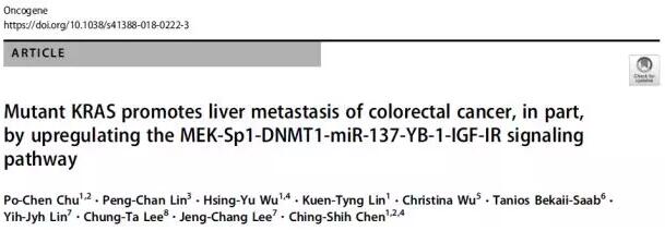 Mutant KRAS promotes liver metastasis of colorectal cancer, in part, by upregulating the MEK-Sp1-DNMT1-miR-137-YB-1-IGF-IR signaling pathway. Oncogene (2018). doi:10.1038/s41388-018-0222-3. Published online:21 March 2018