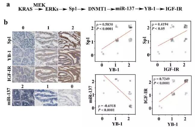 盡管我們都知道胰島素樣生長因子I受體(IGF-IR)能夠促進(jìn)結(jié)直腸癌的肝轉(zhuǎn)移,但是并不清楚腫瘤是通過哪種機(jī)制上調(diào)IGF-IR表達(dá)。研究發(fā)現(xiàn)在結(jié)直腸癌細(xì)胞中,KRAS突變體通過MEK—Sp1—DNMT1—miR-137信號(hào)通路上調(diào)Y-box結(jié)合蛋白1 (YB-1),進(jìn)而轉(zhuǎn)錄激活I(lǐng)GF-IR基因表達(dá)。后續(xù)46例KRAS突變的CRC患者肝轉(zhuǎn)移免疫組織化學(xué)評(píng)估試驗(yàn)也進(jìn)一步證實(shí)這一發(fā)現(xiàn),Sp1、 miR-137、YB-1和IGF-1R之間的表達(dá)顯著相關(guān)。在動(dòng)物模型中,通過基因敲減或MEK藥物抑制下調(diào)YB-1和IGF-IR的表達(dá),可阻止KRAS突變的結(jié)直腸癌肝轉(zhuǎn)移。