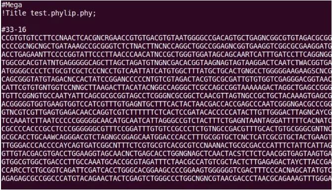 VCF轉(zhuǎn)MEGA格式。用TASSEL打開VCF文件,另存為Phylip格式(Save As — ?Phylip(Interleaved)),如圖3,然后用MEGA7把Phylip文件轉(zhuǎn)換成MEGA格式(File — Convert File Format to MEGA — 選擇剛才轉(zhuǎn)出的Phylip文件按提示操作存成.meg文件),轉(zhuǎn)出的格式如圖4,前兩行為文件頭信息,無實際意義,但是必有。“#33-16”表示樣本編號,與fasta文件的格式不同,mega格式樣本的起始不是“>”而是“#”,接下來便是該樣本的SNP連接成的序列信息。
