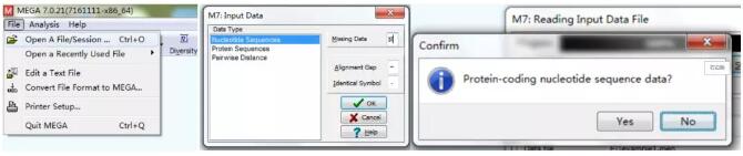 File — Open A File/Session — 選擇要導(dǎo)入的文件,選擇數(shù)據(jù)類型(如果是SNP即為Nuceotide Sequences),提示Protein-coding nucleotide sequence data時,選擇No,即不把DNA序列翻譯成蛋白序列構(gòu)建進化樹,如圖5。