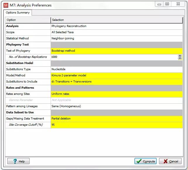 參數(shù)設(shè)置,主要填寫B(tài)ootstrap值,一般選擇500或1000次;Model一般用Kimura 2-parameter Model(K2),如果K2模型運行不了,可以換成p-distance模型;Gaps/Missing Data Treatment選擇Partial deletion或者pairwise deletion,選擇complete deletion時帶有缺失值的標(biāo)記都會被刪除,所以必須謹慎;Site Coverage Cutoff與我們常說的完整度相同,一般填寫成我們過濾標(biāo)記時使用的完整度,上述參數(shù)設(shè)置完成后,點擊compute即可。(見圖6)