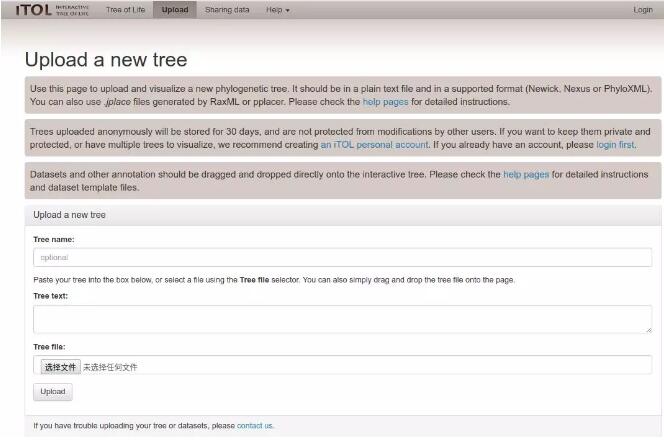 1、打開iTOL主頁以后,選擇上端的Upload選項,出現(xiàn)輸入界面后,可以在Tree text框中粘貼nwk中的內(nèi)容,也可以通過【選擇文件】選項選擇需要展示的進化樹,之后點擊Upload即可。