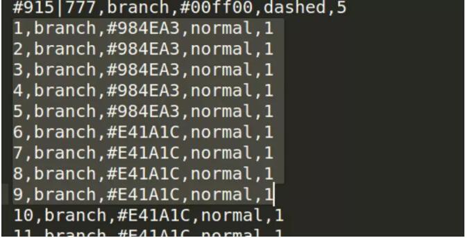 2、進化樹著色,按照iTOL的要求,填寫一個顏色配置文件,填寫方法如該鏈接的說明https://itol.embl.de/help/colors_styles_template.txt,給末端分枝著色的配置文件填寫如下圖,[2,branch,#984EA3,normal,1]中2為樣本ID,branch表示給樹枝上色,#984EA3為16進制顏色代碼,normal表示線條的樣式為正常的實線,1表示枝條的大小為1,該文件必須以.txt結(jié)尾,填寫完成后,將其拖入進化樹的界面即可。