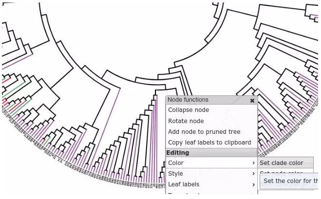 4、分枝顏色的統(tǒng)一。上面的著色例子只對末端分枝進行了著色,有時候,我們需要對某個分枝的樣本進行顏色的統(tǒng)一,可以選中該分枝并點擊鼠標(biāo),在彈出的下拉框中選擇color — set clade color — 選擇想用的顏色或填入對應(yīng)的顏色代碼即可。
