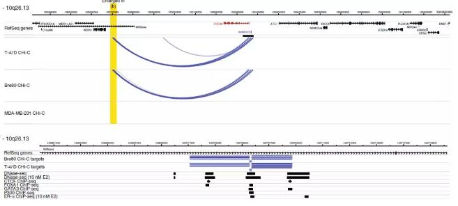 互作peak示例:下圖為10q26.13基因座的互作peak(loop),在ER+乳腺癌細(xì)胞系和正常乳腺上皮細(xì)胞系中鑒定到了互作peak,但是ER-乳腺癌細(xì)胞系中則未檢測到?;プ靼谢虻霓D(zhuǎn)錄起始位點(TSS)位于捕獲區(qū)域內(nèi),并且和相距幾百Kb遠(yuǎn)的特異的HindIII酶切片段形成環(huán)(互作Peak)。在T-47D細(xì)胞系中,這些遠(yuǎn)距離片段與DNase I超敏位點、CTCF、FOXA1、GATA3轉(zhuǎn)錄因子結(jié)合位點以及雌激素受體ERα結(jié)合位點共定位。