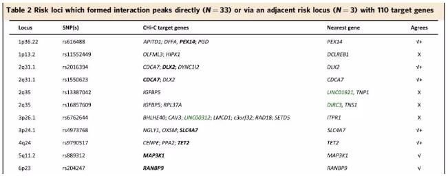 作者將靶基因定義為至少兩個細(xì)胞系中,定位到捕獲區(qū)域內(nèi)或捕獲區(qū)域的順式作用區(qū)間(≤5 Mb)的基因,且其轉(zhuǎn)錄起始位點/TSS定位在相互作用片段上。以此為準(zhǔn)能夠為51個基因座中的33個(64.7%)鑒定到110個推定的靶基因,其中94個為蛋白編碼基因,16個非編碼RNA。作者比較了GWAS風(fēng)險SNP位點的臨近基因以及本研究中鑒定到的靶基因,發(fā)現(xiàn)其中24個基因座的鄰近基因是唯一的CHi-C靶基因(N = 9)或幾個CHi-C靶基因之一(N = 15)。