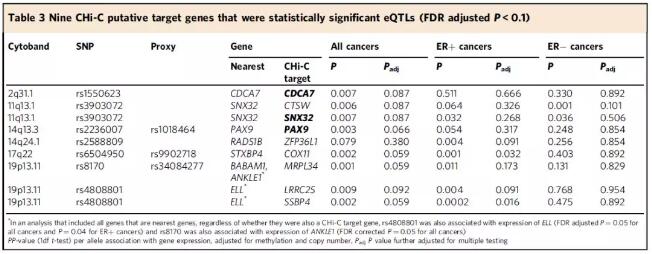 為了評估推定的靶基因在乳腺癌病因中具有因果作用的可能性,作者首先使用風(fēng)險SNP(或與風(fēng)險SNP連鎖不平衡的位點,r2> 0.8)和TCGA數(shù)據(jù)庫中的RNA-Seq數(shù)據(jù)(N=547)進(jìn)行eQTL分析( TCGA),并對匹配的DNA甲基化數(shù)據(jù)和體細(xì)胞拷貝數(shù)變異進(jìn)行了校正,根據(jù)ER狀態(tài)進(jìn)行分層分析。共計鑒定到了22個顯著SNP-基因組合(t檢驗p<0.05),其中9個經(jīng)過多重檢驗FDR校正后仍然顯著。其中,3個基因為鄰近基因。
