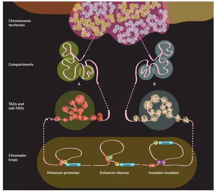 DNA在染色體上是高度折疊的,DNA與DNA片段之間不可避免的形成了高強(qiáng)度的交互作用。2002年提出的3C技術(shù),用于測定染色體特定位點(diǎn)與位點(diǎn)之間的交互作用,隨后發(fā)展出4C、5C 技術(shù),分別用于測定染色體上一點(diǎn)到多點(diǎn)和多點(diǎn)與多點(diǎn)之間的交互作用。Job Dekker在2009年開發(fā)出Hi-C 技術(shù),實現(xiàn)了全基因組范圍內(nèi)染色體片段間相互作用的捕獲。Hi-C 除了用于輔助基因組組裝、對已組裝的基因組進(jìn)行糾錯,還可以揭示基因組的三維結(jié)構(gòu)特征,包括從隔室(A/B Compartments)到拓?fù)湎嚓P(guān)結(jié)構(gòu)域(TAD),最后到染色體環(huán)(loop),目前,已在人、果蠅、酵母、擬南芥、水稻和棉花等物種成功構(gòu)建基因組三維結(jié)構(gòu),并完成了對不同樣本基因組三維結(jié)構(gòu)的比較分析。