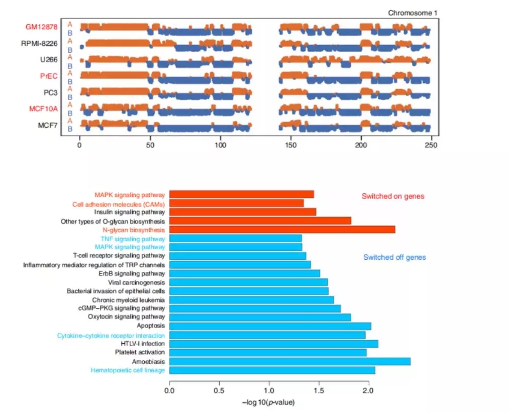 例如在人的多發(fā)性骨髓瘤文章中,作者利用正常B細(xì)胞(GM12878)和兩種亞型的骨髓瘤細(xì)胞(近二倍體U266和近三倍體RPMI-8226)進(jìn)行Hi-C、WGS和RNA-seq測序,結(jié)果發(fā)現(xiàn),相比于GM12878,U266和RPMI-8226癌癥細(xì)胞中6%的區(qū)域均存在B轉(zhuǎn)換到A,1%的區(qū)域均存在A轉(zhuǎn)換到B,結(jié)合RNA-seq數(shù)據(jù),發(fā)現(xiàn)B轉(zhuǎn)換到A區(qū)域內(nèi)的基因變成轉(zhuǎn)錄活躍狀態(tài),而A轉(zhuǎn)換到B區(qū)域內(nèi)的基因變成轉(zhuǎn)錄抑制狀態(tài),KEGG富集通路發(fā)現(xiàn)這些基因與多發(fā)性骨髓瘤相關(guān),主要涉及MAPK信號轉(zhuǎn)導(dǎo)途徑、TNF信號轉(zhuǎn)導(dǎo)途徑、細(xì)胞因子和細(xì)胞因子受體相互作用途徑等,進(jìn)一步在染色體2q11.2-q12.142處發(fā)現(xiàn)一個細(xì)胞因子基因簇,幾種白細(xì)胞介素IL1R1,IL1R2,IL18R1和細(xì)胞因子MAP4K4下調(diào)表達(dá),這些基因在后續(xù)研究中重點(diǎn)關(guān)注。