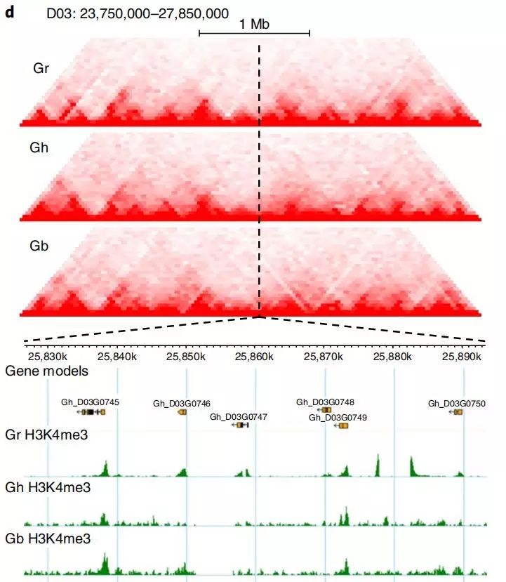 例如,在棉花的三維基因組進(jìn)化文章中,作者對二倍體雷蒙德氏棉、二倍體亞洲棉、四倍體陸地棉和四倍體海島棉構(gòu)建了三維基因組圖譜,與雷蒙德氏棉D(zhuǎn)03染色體相比,陸地棉和海島棉對應(yīng)的D亞基因組中發(fā)生了染色質(zhì)重排,虛線對應(yīng)的TAD結(jié)構(gòu)發(fā)生了變化,雷蒙德氏棉中該TAD結(jié)構(gòu)完整,存在明顯的邊界,陸地棉中該邊界發(fā)生了左移,而海島棉中該TAD趨向于消失。因而通過鑒定TAD發(fā)生變化區(qū)域的基因,可以研究多倍化過程中基因表達(dá)調(diào)控的改變(研究多倍體的老師們,這可是一個很好的套路文章哦)。同時結(jié)合ChIP-seq數(shù)據(jù)對該TAD邊界進(jìn)行分析發(fā)現(xiàn),雷蒙德氏棉富含豐富的H3K4me3(活性染色質(zhì)標(biāo)記),而陸地棉和海島棉中H3K4me3顯著減少,說明在棉花的多倍化與表觀遺傳修飾存在密切關(guān)聯(lián)。
