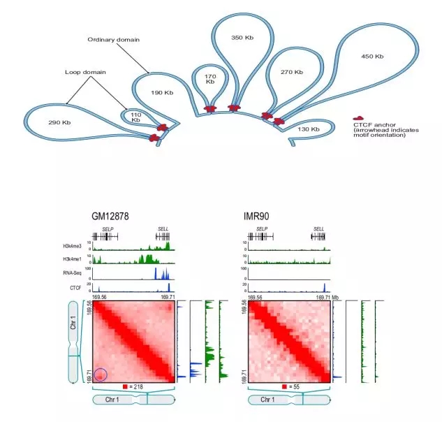 例如,在人的loop文章中,作者在GM12878細(xì)胞系發(fā)現(xiàn)9448個loop,其中2854個loop與已知的啟動子-增強(qiáng)子作用相關(guān),基因的啟動子存在loop比不存在loop時的表達(dá)量顯著增加。GM12878細(xì)胞系中存在一個Loop,這個Loop連接了SELL啟動子和一個遠(yuǎn)端增強(qiáng)子SELP,基因開啟轉(zhuǎn)錄,表達(dá)量增加,而IMR90細(xì)胞系中沒有這個Loop,基因不表達(dá)。