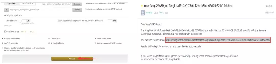 3.其他參數(shù)默認(rèn),點(diǎn)擊“submit”申請(qǐng)次級(jí)代謝產(chǎn)物預(yù)測(cè)結(jié)果,大約12h內(nèi),系統(tǒng)運(yùn)行結(jié)束后,預(yù)留郵件會(huì)收到預(yù)測(cè)結(jié)果;