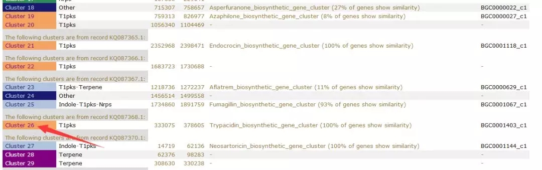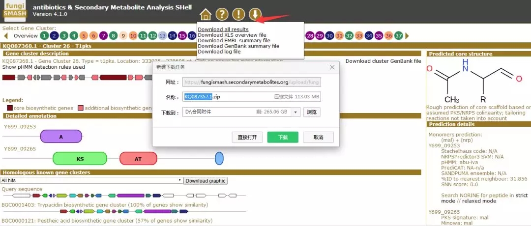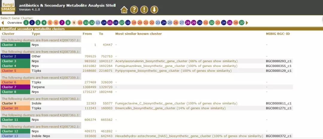 4.進(jìn)入預(yù)留郵箱查看預(yù)測(cè)結(jié)果,打開預(yù)測(cè)結(jié)果網(wǎng)址即可查看結(jié)果,包含基因簇序列編號(hào),次級(jí)代謝產(chǎn)物類型,基因簇所在位置,與已知次級(jí)代謝基因簇的結(jié)果比對(duì)等;