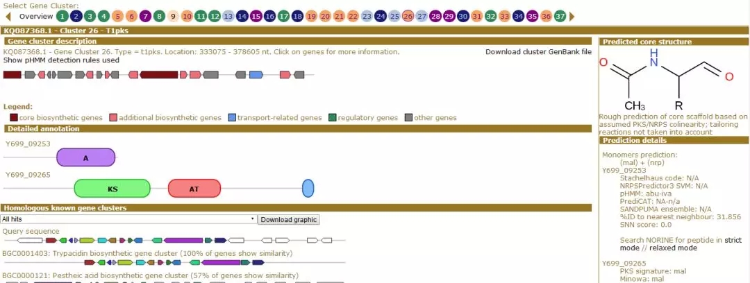 5.點(diǎn)擊所關(guān)注的基因簇,可獲該基因簇的詳細(xì)信息,包括基因簇基因組成,核心基因的功能域組成以及與已知基因簇間共線性展示結(jié)果等;