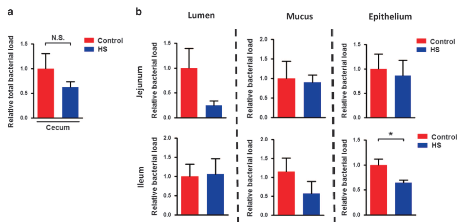 慢性高鹽HS喂養(yǎng)后,盲腸中的總細菌負荷略微降低。分離不同部位的菌群,慢性HS喂養(yǎng)后,回腸上皮和結(jié)腸腔內(nèi)的細菌負荷也降低。