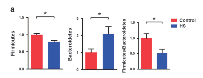 慢性HS處理顯著降低厚壁菌門水平,并提高擬桿菌門的水平,這表明菌群組成在HS攝入后發(fā)生改變。