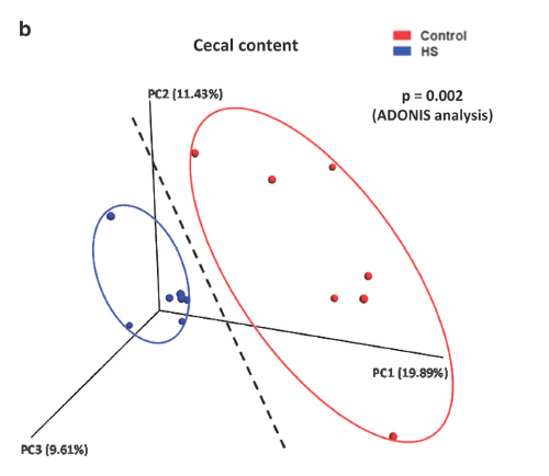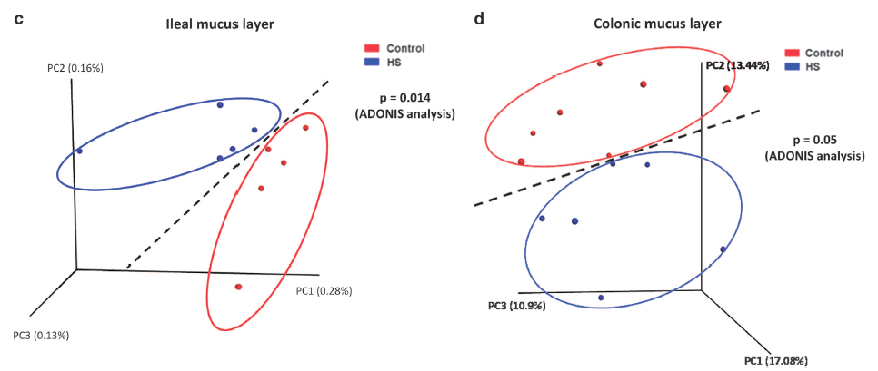 16S rRNA測序表明, HS組的盲腸內(nèi)容物(cecal content)菌群組成與對照小鼠相比,在門和綱水平上明顯不同。特別是在HS處理后,盲腸內(nèi)容物中放線菌門和厚壁菌門中的Actinobacteria、Firmicutes和Bacteroidetes以及綱水平中的Actinobacteria,Clostridia和Bacteroidia所占比例顯著改變。使用未加權(quán)的uniFrac分析的主坐標分析(PCoA)顯示,HS組和對照組盲腸內(nèi)容物菌群分別聚類(P = 0.002,ADONIS分析)。粘膜細菌也是影響腸道病理生理狀態(tài)的重要因素,回腸粘膜( ileal mucosa)和結(jié)腸粘膜(colonic mucosa)在整個胃腸道中的細菌數(shù)量最多。因此,進一步分析了位于回腸粘膜層和結(jié)腸粘膜層的細菌。未加權(quán)的uniFrac分析顯示,HS組和對照組在回腸粘液層分別聚類(P = 0.014,ADONIS分析)。而在結(jié)腸粘液層,對照組和HS組也形成兩個聚類類別,分離趨勢明顯(P =0.05,ADONIS分析)。