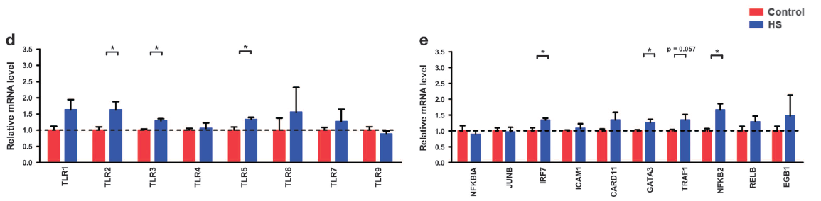 通過二代測序進行轉(zhuǎn)錄組測序分析,比較對照組和HS組之間涉及“細胞因子-細胞因子受體相互作用”、“NF-κB信號通路”和“Toll樣受體信號通路”的所有相關(guān)基因的表達。結(jié)果表明回腸和結(jié)腸中,兩組之間許多基因的表達存在差異。