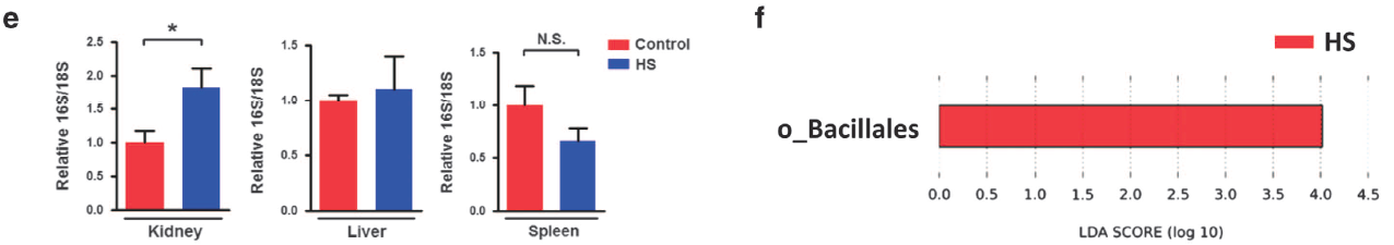 腸道通透性增加可能導(dǎo)致腸道細菌或細菌產(chǎn)物易位至腸外組織。通過使用16s PCR來識別細菌DNA,檢測腎臟、肝臟和脾臟中的細菌易位。有趣的是,慢性HS攝入促進了細菌易位進入腎臟,但不會進入肝臟或脾臟。LEfSe試驗結(jié)果表明,與對照組相比,HS處理的腎臟中富含屬于腸道細菌的桿菌。與對照動物的腎臟相比,在HS喂養(yǎng)的腎臟中,芽孢桿菌(Bacillus)和游動微菌(Planomicrobium)分別增加了2.6倍和8.7倍。