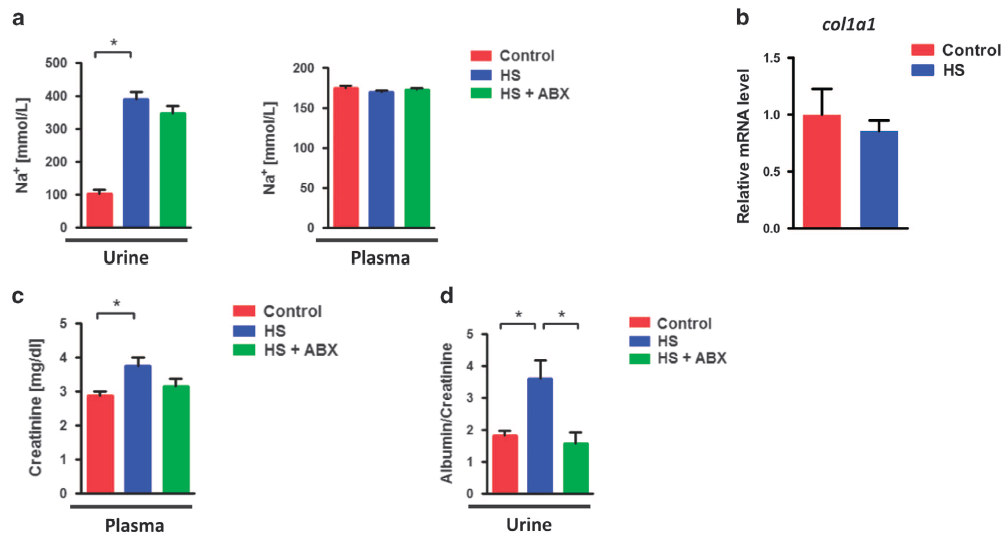 給予小鼠抗生素(多粘菌素B和新霉素,antibiotics,ABX)處理后,恢復(fù)了HS喂養(yǎng)誘導(dǎo)的回腸IFN-γ的過表達和腸道滲漏。通過尿和血漿Na +濃度測量,發(fā)現(xiàn)抗生素并不改變鈉負荷。HS喂養(yǎng)增加了血漿肌酐(creatinine)水平,與HS治療相比,抗生素治療后具有較低但不顯著的血漿肌酐水平。HS喂養(yǎng)小鼠的腎功能障礙主要標志物–尿白蛋白/肌酐比率顯著增加,但抗生素治療幾乎可以完全恢復(fù)腎功能。抗生素施用還可以降低HS誘導(dǎo)的凋亡細胞升高。以上結(jié)果表明,抗生素治療能夠改善HS喂養(yǎng)引起的腸道滲漏和早期腎損傷。