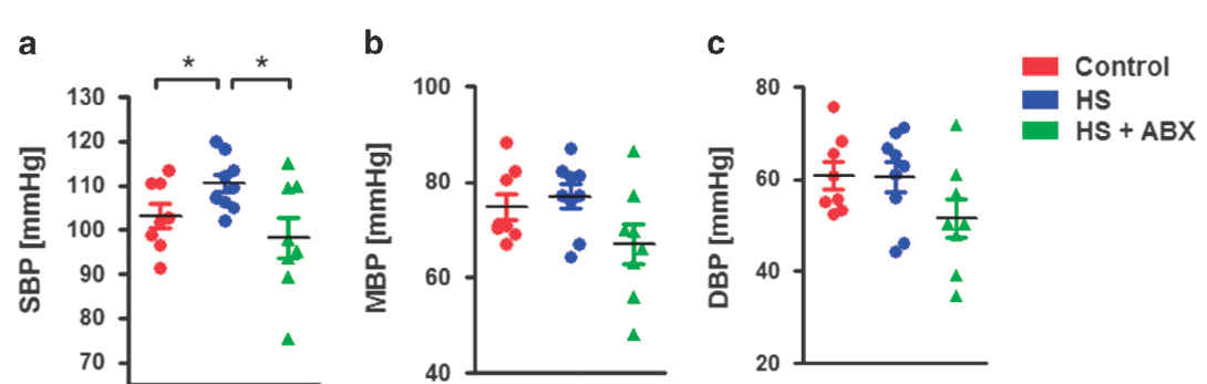 慢性HS喂養(yǎng)可能導(dǎo)致動脈壓升高。 雖然HS處理的小鼠的舒張壓(DBP)和平均血壓沒有增加,但收縮壓(SBP)在慢性HS喂養(yǎng)后顯著升高。有趣的是,抗生素治療能夠完全恢復(fù)正常SBP。這些數(shù)據(jù)強烈表明,慢性HS喂養(yǎng)引起的SBP升高取決于腸道微生物菌群。