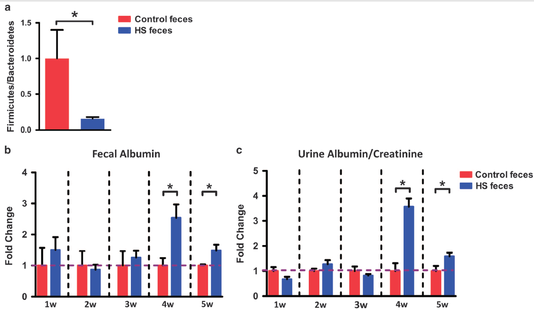 糞便微生物菌群移植實驗:喂食正常飲食的兩組小鼠口服來自對照和HS處理的小鼠的糞便。移植8周后,接受對照糞便的對照小鼠中的微生物菌群組成改變的主要標記物–盲腸厚壁菌/擬桿菌比例明顯高于接受HS糞便的小鼠,這一點與作者之前的數(shù)據(jù)一致,表明HS喂養(yǎng)會降低盲腸中的厚壁菌 / 擬桿菌比例,并說明了糞便微生物菌群移植實驗是成功的。給藥4周后,糞便白蛋白含量檢測結(jié)果表明,接受HS喂養(yǎng)糞便的小鼠的腸通透性顯著增加。并且,尿白蛋白(albumin)/肌酸酐(creatinine)比率(在當前研究中觀察到的腎功能障礙的主要表型),在移植4周后接受HS喂養(yǎng)的糞便的小鼠中也顯著增加。最后,與對照小鼠相比,HS糞便移植小鼠中的腎臟凋亡細胞數(shù)量顯著增加。
