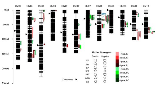 研究人員對多個(gè)雜交水稻組合的產(chǎn)量優(yōu)勢性狀進(jìn)行多年、多地點(diǎn)的綜合分析發(fā)現(xiàn):每穗小花數(shù)和有效穗數(shù)是造成兩系雜交稻產(chǎn)量優(yōu)勢的主要原因,而且前者有超親優(yōu)勢,后者只有超父本優(yōu)勢。之后對源自LYP9后代的每個(gè)重組自交系(RIL)群體進(jìn)行重測序的基礎(chǔ)上,構(gòu)建了一張高分辨率的遺傳連鎖圖,并利用RIL群體及其與母本回交的RILBC1群體進(jìn)行產(chǎn)量相關(guān)性狀的遺傳定位,鑒定了一系列產(chǎn)量及其他優(yōu)勢相關(guān)性狀的QTL位點(diǎn)。同時(shí),結(jié)合對幼穗發(fā)育早期的轉(zhuǎn)錄組分析以及QTL定位的結(jié)果,確定了多個(gè)與雜種優(yōu)勢相關(guān)候選基因。此外,還對一個(gè)產(chǎn)量雜種優(yōu)勢的主效位點(diǎn)進(jìn)行了圖位克隆,發(fā)現(xiàn)rice heterosis 8 (RH8) 位點(diǎn)實(shí)際上是由DTH8/Ghd8/LHD1編碼的光周期調(diào)控的節(jié)律基因,它同時(shí)控制開花期、株高、分蘗數(shù),每穗小花數(shù)等多種性狀。隨后對361份雜交稻(其中包括125份二系雜交稻)的基因型解析后發(fā)現(xiàn),RH8的雜合性是兩系法雜交稻基因型的主要類型。